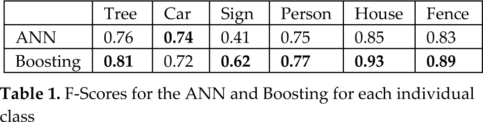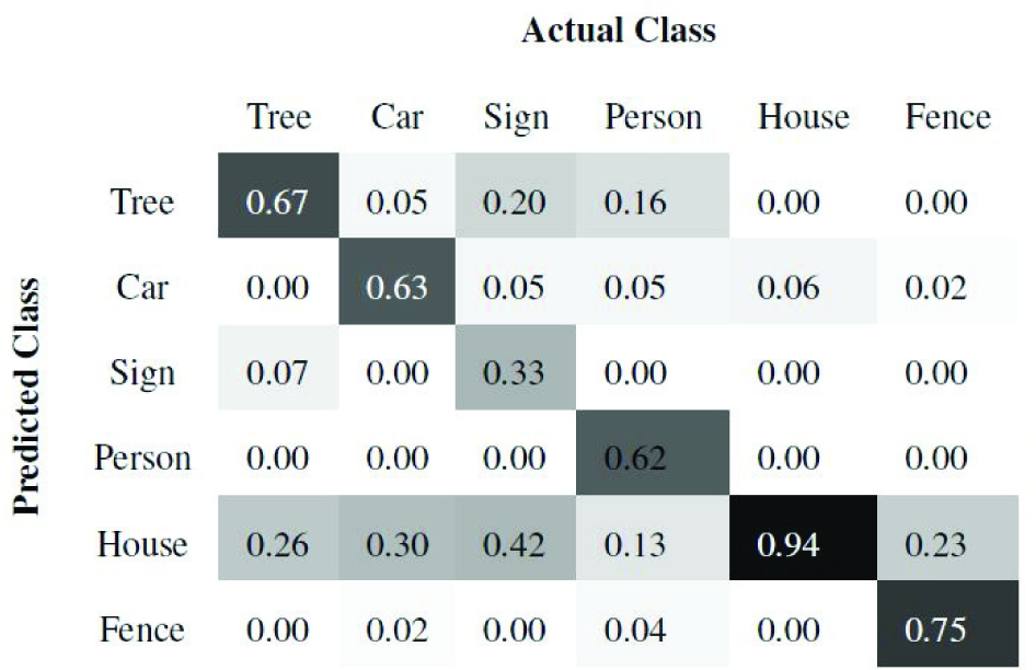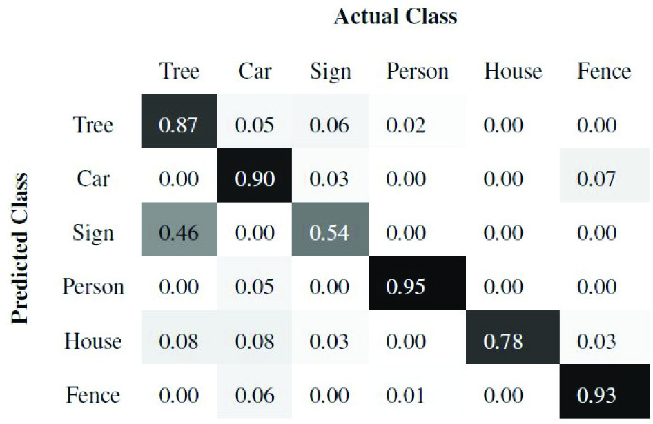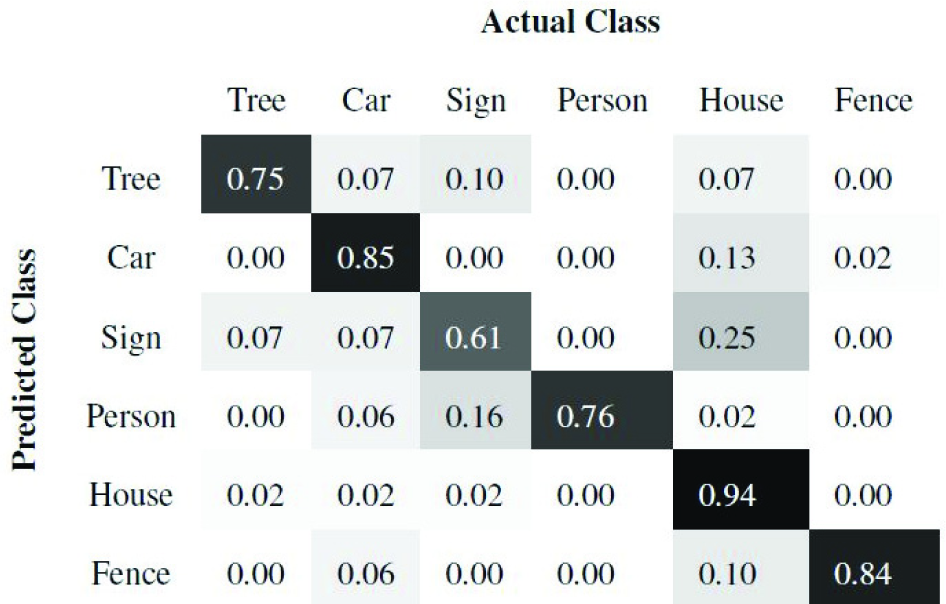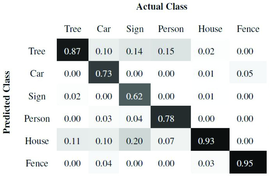 Of the 10 scenes, we train using seven and test on the remaining three scenes. Once the super-segments are classified, all the points belonging to a super-segment are labelled with the same class as the super-segment. Figures 7 and 8 present the precision and recall confusion matrices between the six classes over all 10 scenes using the ANN classifier. Figures 9 and 10 present the precision and recall confusion matrices using the Boosting classifier. As we can infer from Figures 7–10, the ANN achieves better recall than Boosting. In contrast, Boosting achieves better precision than the ANN. Therefore, we use the F-score as defined in Equation (9) to evaluate the classifiers. As Table 1 illustrates, Boosting outperforms the ANN for each individual class.
