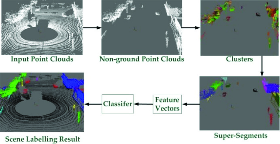Two main groups of techniques exist for semantic segmentation of 3D point clouds. The first group, called point-based techniques, are based on classifying every point with features that take neighbouring points into account. In [6], for every point to be labelled, some neighbouring points are picked by a fixed radius sphere or cylinder, and properties of the local neighbourhood of a point, such as how planar the neighbourhoods are or the height of the neighbouring points, are computed. Then, Associative Markov Network (AMN) models, which enforce the preference that adjacent points have the same label, are applied for the supervised learning. More recently, some more efficient approaches, such as using anisotropic models [7], higher-order cliques with Conditional Random Field (CRF) models [8, 9], and Non-AMN models [10, 11], have been proposed. A different approach is presented in [12] that involves combining the top-down cues available from object detection using local 3D feature detectors and descriptors and bottom-up MRF for the purpose of semantic segmentation. Generally speaking, the main advantage of the above methods is that the graphical models can optimize the segmentation and classification jointly by minimizing the energy function defined over the graph representing the 3D points and their neighbouring points. However, the training of the model is represented by a high computational cost. With the learned parameters, the inference also takes a long time. Furthermore, a feature that only takes very small-scale neighbourhoods into account lacks distinctive information.