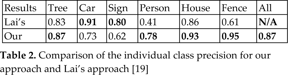 We also compare our approach to the method described by Lai in [19], which adopts a “soup of segments” segmentation of point clouds and the Grid Spin Image Signatures features. Lai's method achieved an average F-score of 0.67, which is lower than most individual class's F-scores for Boosting in Table 1. As far as the individual class precision is concerned, our super-segments based method yields better results for four classes, as Table 2 demonstrates. The overall accuracy is 87%. There are two categories (Car and Sign) for which our approach's performances are not as good as those in [19] due to a lack of detailed shape features, such as Spin Image Signatures. In particular, the signs and some small trees have similar dimension features and it can be difficult even for humans to distinguish them. Figures 11 and 12 show some of the qualitative results of the test scene, achieved by our approach using Boosting.