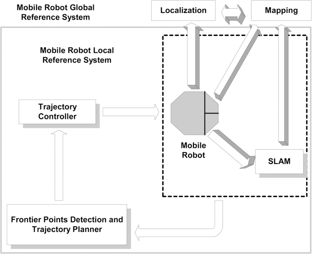 Figure 3 shows the Active SLAM architecture implemented in this work. The localization and mapping procedures are carried out at the global reference frame, i.e., the system state variables are defined at this global frame. Nevertheless, the EKF-SLAM is executed at a local reference frame level. Thus, the data association and the features' prediction and extraction are taken into account at the local reference frame attached to the robot. The frontier points detection, the trajectory planning and the trajectory control are calculated and executed at the local reference frame with the information stemming from sensor measurements.