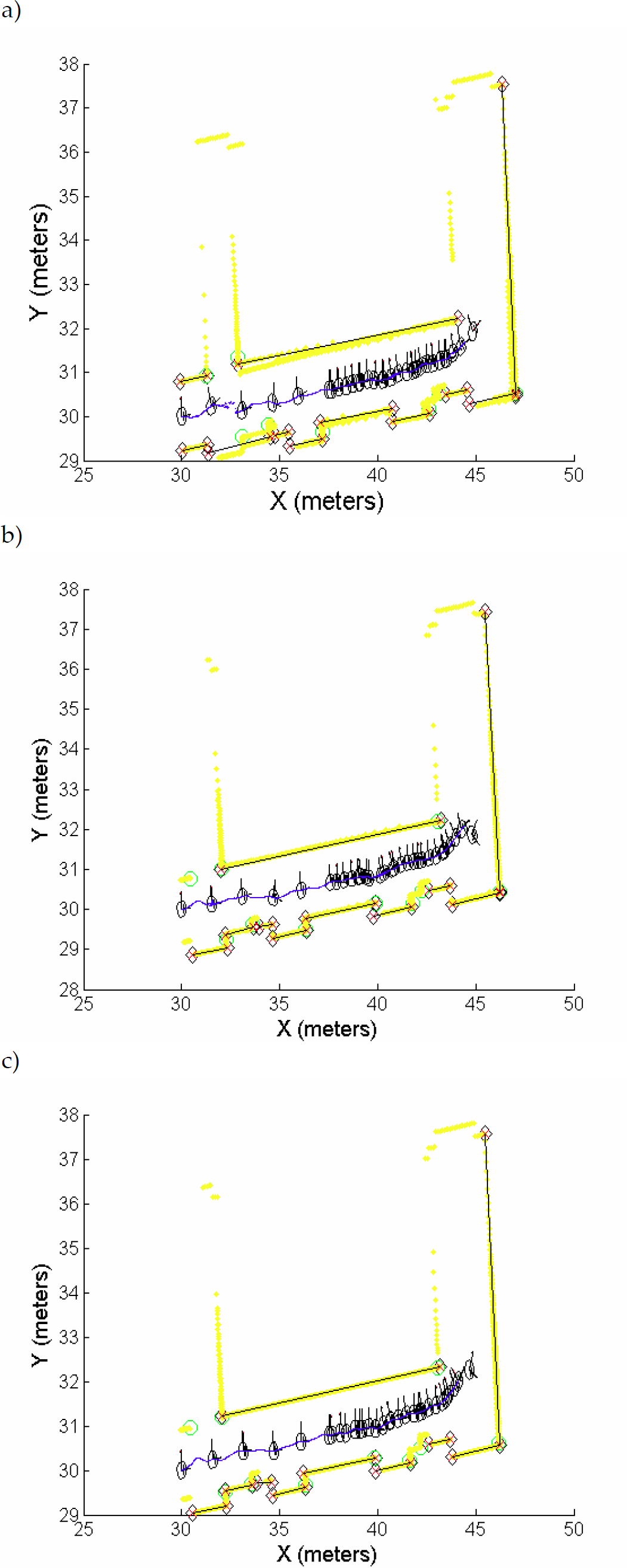 Real time experimental results. a) Map reconstruction of the facilities at the Instituto de Automatica using the sequential EKF-SLAM system state; b) map reconstruction using the EKF-SLAM with entropy feature selection system state, and c) map reconstruction using the EKF-SLAM with covariance sensibility feature selection procedure system state. In the three experiments the robot was left at the same position inside the Instituto de Automatica, although its orientation varied.