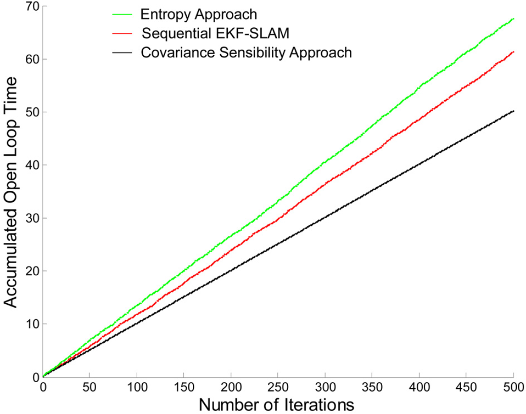 Accumulated robot's open loop time. The time the robot remains in an open loop state is shorter for the covariance sensibility approach than for the classical sequential EKF-SLAM or for the entropy feature selection approach.