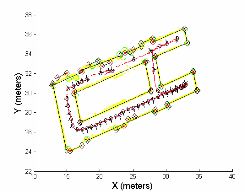 In order to show consistence, the true location of the robot in the environment is needed for comparison purposes. Figure 4.a shows the simulated environment with the expected trajectory. The environment was created using the MobileSim® tools (provided by ActivMedia®). Figure 4.b shows the map reconstruction and the actual path travelled by the robot. The mobile robot drives according to the control strategy presented in the previous section. The green circles (