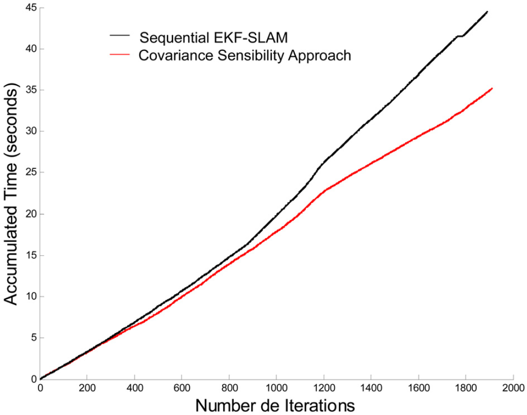 Accumulated SLAM processing time. The EKFSLAM with the covariance sensibility approach demands lesser processing time per iteration than the classical sequential EKF-SLAM or the entropy feature selection approach.