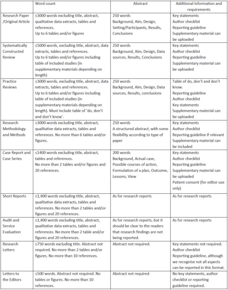 Structure: We ask for a structured abstract and paper, but recognise that pre-specifying the structure may not enable the innovative articles we seek. Abstracts should be ≤ 250 words and presented under headings that guide the reader to the content of the full paper. This is likely to include a background that highlights why this area is important and what is already known, a statement of the purpose of the paper, information on the evidence used to support the information presented, and the key learning points of the paper. Our standard instructions (as for an original article) on figures, tables, key statements and referencing etc. remain.