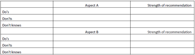 The main purpose of a Practice Review is to provide a summary of “Dos, Don’ts and Don’t Knows” on a specific subject in clinical practice. Following a brief introduction, including the context, scope and methods used to conduct the review the remainder of the submission should be divided into a tabulated digest summarising each aspect of the evidence item by item, providing the relevant supporting evidence, and indicating the strength of the evidence for each particular item. It remains important that the evidence underpinning the review has been obtained and summarised in a robust, reproducible fashion, usually underpinned by a systematically constructed review.